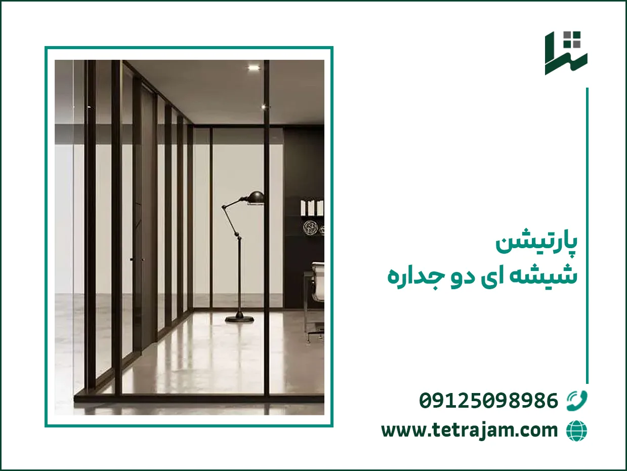 با استفاده از پارتیشن شیشه ای دو جداره میتوان برای کف تا سقف یک پوشش کامل ایجاد کرد و آن را در دو نوع مسطح یا متقاطع اجرا کرد. همچنین میتوان بر روی این شیشه ها هر نوع نقشی را بر اساس طراحی خاص پیاده کرد. این پارتیشن ها قابلیت جدا شدن و استفاده مجدد را ندارند. پارتیشن شیشهای دوجداره یکی از انواع پارتیشن اداری شیشه ای است که به ویژگیها