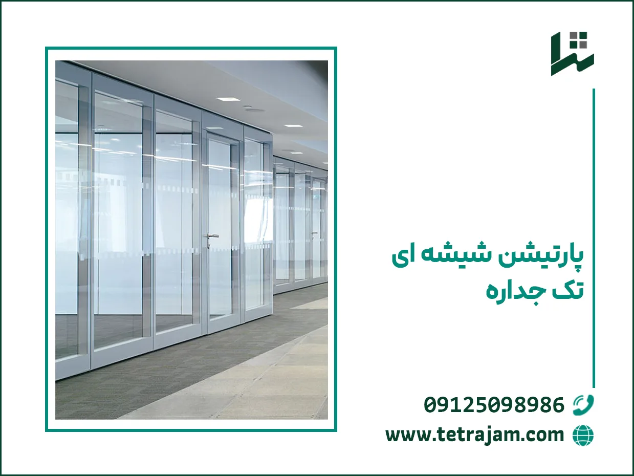پارتیشن اداری شیشه ای تک جداره یک پروژه کامل برای ارتفاعات کف تا سقف ایجاد میکند و قابلیت دارد در دو مدل مسطح و متقاطع پیکربندی شود. بر روی این نوع پارتیشن امکان اجرای هر طرح و نقشهای وجود دارد و نصب و راه اندازی آن به صورت کاملاً خشک و بدون هیچ چسبی انجام میشود. از دیگر ویژگیهای این نوع پارتیشن آن است که به طول کامل قابلیت جدا شدن دارد و میتوان مجدداً از آن استفاده کرد.پارتیشن شیشه ای تک جداره نسبت به پارتیشن شیشهای دوجداره دارای ابعاد کمتری بوده و ضخامت کمتری نیز دارند. این پارتیشنها بسیار مناسب برای تقسیم و جداسازی فضاهای کوچک میباشند، اما از نظر عایق بودن در برابر صدا و محدودسازی دید، عملکرد ضعیفتری نسبت به پارتیشن شیشه ای دوجداره دارند.